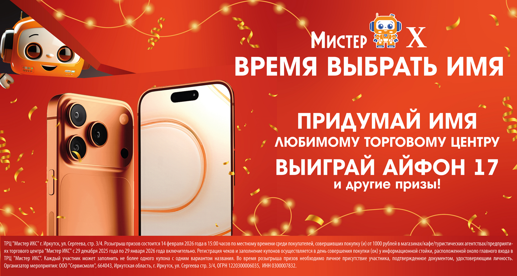 ТРЦ "Мистер ИКС" г.Иркутск, ул.Сергеева, стр. 3/4. Розыгрыш призов состоится 14 февраля 2026 года в 15:00 часов по местному времени среди покупателей, совершивших покупку(и) от 1000 рублей в магазинах/кафе/туристических агентствах/предприятиях центра "Мистер ИКС" с 29 декабря 2025 года по 29 января 2026 года включительно. Регистрация чеков и заполнение купонов осуществляется в день совершения покупки(ок) у информационной стройки, расположенной около главного входа в ТРЦ "Мистер ИКС". Каждый участник может заполнить не более одного купона с одним вариантом названия. Во время розыгрыша призов необходимо личное присутствие участника, подтвержденное документом, удостоверяющим личность. Организатор мероприятия: ООО "Сервисмолл", 664043, Иркутская область, г. Иркутск, ул. Сергеева стр. 3/4, ОГРН 1220300006035, ИНН 0300007832.